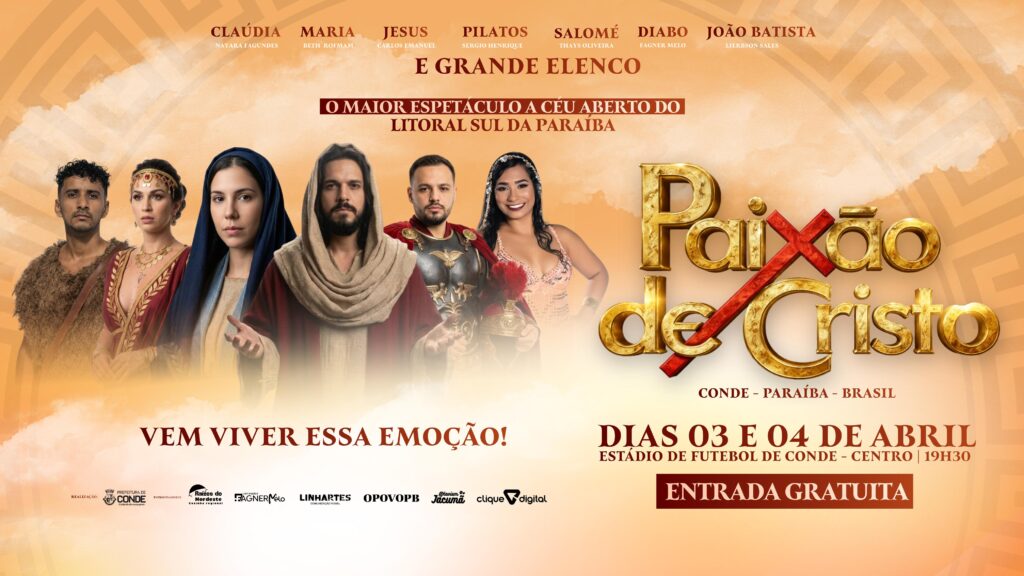 A emoção da Semana Santa já tem data marcada em Conde. Nos dias 03 e 04 de abril, o município recebe mais uma edição da Paixão de Cristo, considerada o maior espetáculo a céu aberto do Litoral Sul da Paraíba, com expectativa de público entre 5 mil e 7 mil pessoas.