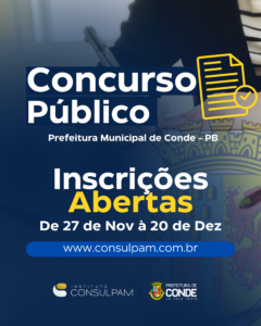 Para maiores informações, acesse o edital no site da Prefeitura de Conde, no chat disponível no site do Instituto Consulpam ou na Coordenação de Concurso do Instituto Consulpam, por meio dos telefones (85)3224-9369 e (85) 9957-9369 (WhatsApp).