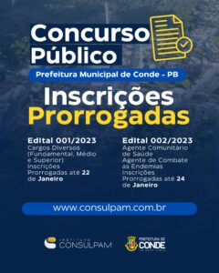 A Prefeitura de Conde está com dois editais abertos para Concurso Público. O Edital 001/2023 está oferecendo 369 vagas para todos os níveis de escolaridade, em cargos diversos, sendo 139 para Ampla Concorrência, 11 vagas para Pessoas Com Deficiência (PCD) e 219 para Cadastro de Reserva. As inscrições foram prorrogadas até o dia 24 de janeiro.