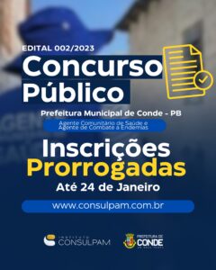 As inscrições para o Edital 002/2023 do Concurso Público da Prefeitura de Conde foram prorrogadas até o dia 24 de janeiro. A informação foi publicada no diário oficial da última quinta-feira (04) e também no site da empresa organizadora, a Consulpam.