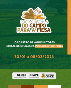 A Prefeitura de Conde lançou o Edital de Chamada Pública para credenciamento de agricultores familiares e cooperativas agropecuárias que desejem fornecer alimentos para o Programa do Campo para Mesa. O