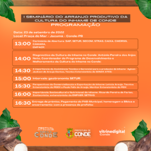 A Prefeitura Municipal de Conde abre nesta sexta-feira (23), a primeira edição do Festival do Inhame e Brega Conde. O evento será realizado na Praça do Mar em Jacumã e também contará com um espaço para a realização de seminários direcionados para a cultura do inhame e gastronomia.