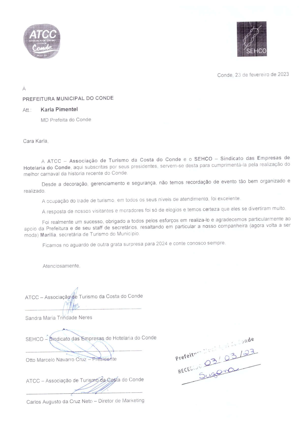 Reiterando a realização deste trabalho, o município recebeu da Associação de Turismo da Costa de Conde (ATCC) e do Sindicato das Empresas de Hotelaria do Conde (SEHCO), uma cara em agradecimento à Prefeita Karla Pimentel e sua equipe, pelo trabalho realizado durante o evento.