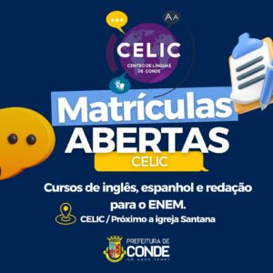 O Celic (Centro de Línguas de Conde), da Prefeitura Municipal de Conde, está com matrículas abertas para novas turmas de inglês, espanhol e redação para o Enem. Os cursos são gratuitos e os interessados devem procurar a unidade do Centro de Línguas, que fica próximo a Igreja Santana, de segunda a sexta-feira, das 08h às 17h.