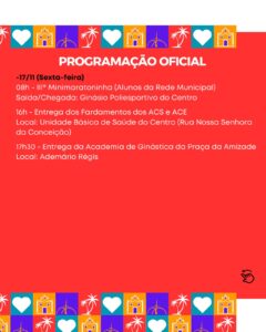 Seguindo a programação festiva, na sexta-feira (17), véspera do aniversário da cidade, a Secretaria de Educação promove a IIIª Minimaratoninha com os alunos da Rede Municipal, com trajeto do Ginásio Poliesportivo do Centro até a Igreja Matriz. A tarde, a Secretaria de Saúde realiza na Unidade Básica de Saúde do Centro, a entrega dos novos fardamentos para os Agentes Comunitários de Saúde e Agentes de Combate às Endemias e para encerrar o dia, a prefeita Karla Pimentel entrega aos moradores do Ademário Régis, a Academia de Ginástica na Praça da Amizade.