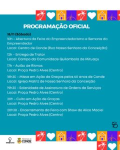 No sábado, 18 de novembro, dia do aniversário da cidade, a programação tem início às 10h da manhã com a abertura da Iº feira do Empreendedorismo, promovida pela Secretaria da Fazenda, por meio do InvestConde. A feira também marcará a abertura da Semana Estadual do Empreendedorismo. Na Feira, participam expositores do Sebrae, Caixa Econômica Federal, Banco do Nordeste, InvestConde, Frente Parlamentar do Empreendedorismo, Secretaria de Saúde, Secretaria de Desenvolvimento Social e Empreendedores do município.
