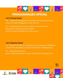 A programação inicia na próxima terça-feira (14), com a Mostra Pedagógica e Premiação do Concurso de Redação e Olimpíadas de Inglês. Na quarta-feira, dia 15 de novembro, a Gerência Executiva de Juventude realiza a Etapa Conde do Campeonato de Esportes Radicais e a Batalha de Rimas, na pista de Skate ao lado do Ginásio Poliesportivo do Centro.