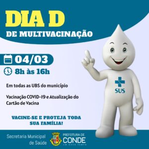 A Prefeitura de Conde por meio da Secretaria de Saúde, promove neste sábado (04), o Dia D de vacinação. Durante todo o dia, serão aplicadas as doses contra a Covid-19, já incluindo o imunizante Bivalente da Pfizer e também a atualização do cartão de vacinação com as doses de que fazem parte do esquema de vacinas.
