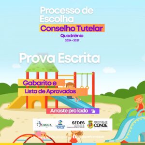 A Prefeitura de Conde por meio da Secretaria de Desenvolvimento Social (SEDES) e do Conselho Municipal dos Direitos das Criança e do Adolescente (CMDCA), publicou na edição Nº 2.234, do Diário Oficial do município de Conde, o gabarito e o resultado final da Prova Escrita aos candidatos às vagas do Conselho Tutelar de Conde. As provas aconteceram no último dia 25 de junho e 23 candidatos estavam aptos a realização do exame.