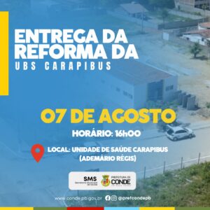 Nesta segunda-feira, dia 07 de agosto, a Prefeita de Conde, Karla Pimentel fará a entrega da UBS Carapibus que foi totalmente reformada e requalificada para melhor atender as mais de 4 mil famílias que vivem na região e precisam dos atendimentos oferecidos pela Unidade de Saúde.