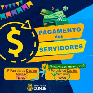 A Prefeita Karla Pimentel antecipou o pagamento da primeira parcela do décimo terceiro salário, dos servidores da Prefeitura Municipal de Conde, para esta sexta-feira (10). O pagamento seria efetuado no dia 15 de junho, mas, depois de uma reunião com a equipe que cuida das finanças do município, a prefeita optou pela antecipação.