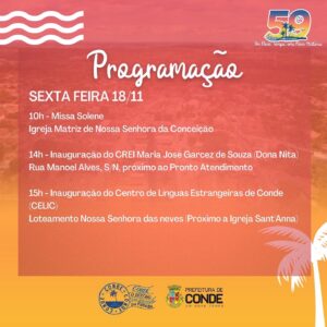 A programação inicia às 10h com a Missa Solene, na Igreja Matriz de Nossa Senhora da Conceição, no Centro da cidade. A tarde serão inaugurados o CREI Maria José Garcez de Souza (Dona Nita), no Loteamento Nossa Senhora da Conceição e o Centro de Línguas de Conde (CELIC), no Jardim Planalto. “O Conde vive um momento de crescimento em diversas áreas e celebrar seus 59 anos com tantas coisas boas para a população é muito gratificante. O aniversário é da cidade, mas a gestão segue trabalhando em benefício do povo condense”, destacou a Prefeita Karla Pimentel.