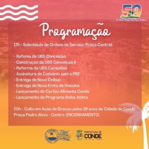 A Prefeitura Municipal de Conde realiza nesta sexta-feira (18), um dia de programação diversificada com celebrações, inaugurações e assinaturas de ordens de serviço em comemoração o aniversário de 59 de emancipação política do município.
