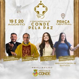 Dando seguimento ao calendário de eventos que serão promovidos no município, a Prefeitura de Conde realiza nesta sexta e sábado (19 e 20/08), no Centro da cidade, a primeira edição do Encontro da Fé – Conde Pela Paz. As apresentações musicais iniciam às 19h com shows dos Padres Nilson Nunes e Puan Ramos, Stella Laura, Niedja Cavalcanti e Erijackson & Banda.