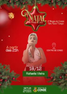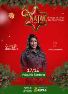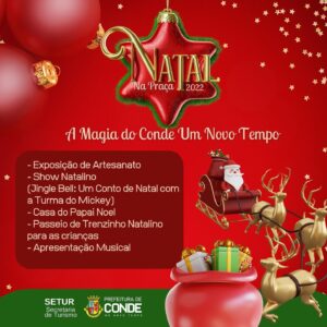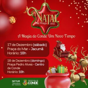 A Prefeitura de Conde, por meio da Secretaria de Turismo (Setur), promove neste sábado e domingo (17 e 18/12), a segunda edição do Projeto “Natal na Praça – A Magia do Conde”, para celebrar as Festas Natalinas. Os eventos acontecem na Praça do Mar, em Jacumã (17/12) e na Praça Pedro Alves, no Centro de Conde (18/12), a partir das 18h.