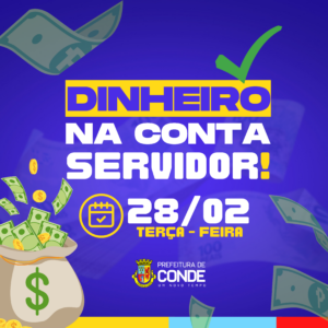 A Prefeitura Municipal de Conde paga os salários dos servidores municipais da ativa, na próxima terça-feira, dia 28 de fevereiro. Os aposentados e pensionistas do CondPrev receberam seus proventos na sexta-feira (24). Desde janeiro de 2021, a gestão municipal reforça seu compromisso de pagamento em dia e dentro do mês trabalhado.
