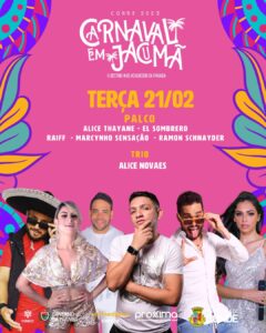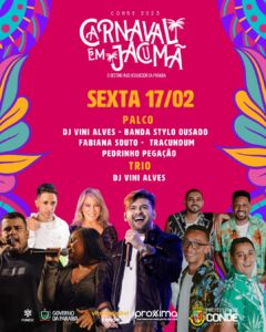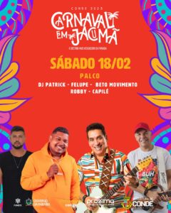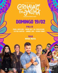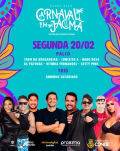 A Prefeitura de Conde divulgou no início da noite desta sexta-feira (10), a programação do Carnaval 2023 da cidade. A festa que não era realizada no município desde 2021, por conta da pandemia de COVID-19, volta com uma programação diversificada com nomes locais, regionais e nacionais que vão se apresentar no palco da Praça do Mar, na Praia de Jacumã entre os dias 17 e 21 de fevereiro.
