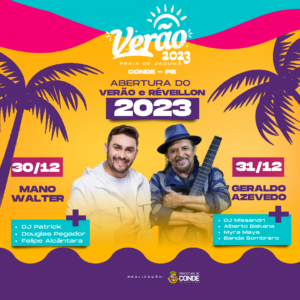 Além do Réveillon, a Prefeitura de Conde promove no dia 30 de dezembro, a abertura do projeto Verão 2023, onde serão realizados shows musicais todos os sábados de janeiro, na Praça do Mar com artistas locais, regionais e nacionais. No lançamento do projeto, se apresentam o DJ Patrick, Felipe Alcântara (Felipinho), Douglas Pegador e Mano Walter.